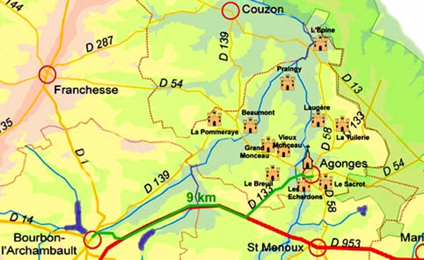 Appuyé contre la forêt domaniale des Prieurés Bagnolet, le village d'Agonges se penche sur la riante vallée de l'Ours, dont les eaux grossissent la Burge avant d'atteindre la ferme fortifiée de Lépine. Il s'agit là d'un des treize châteaux, manoirs et maisons fortes qui caractérisent le territoire communal. Agonges, dominée par une église romane du XIIe siècle rougeoyante, est le siège de l'Union de Testage de la Race Charolaise, qui travaille depuis plusieurs décennies à améliorer la génétique des génisses.