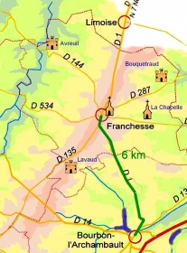 Construit sur la dernière arête du Massif Central avant les plaines de l'Allier et de la Loire, le bourg de Franchesse embrasse au levant la vallée de la Burge et au couchant celle de la Bieudre, les deux petites rivières qui arrosent l'essentiel de notre territoire communautaire. Des fossés existent encore, rappelant que le village était jadis fortifié, bien que lieu de passage de voies romaines importantes. On ne sait trop pourquoi les habitants sont dénommés "Lanciers", mais, en revanche, l'on sait que les femmes du village, sous la houlette de Françoise Chaput, se sont violemment opposées à la destruction de l'église Saint-Etienne après qu'elle eut été vendue comme bien national, en 1791, à un maçon des environs. A contempler aujourd'hui cette charmante église romane des XIIe et XIVe siècles, fière sur son éperon rocheux, comment ne pas dire merci à ces pionnières de la protection du patrimoine ?